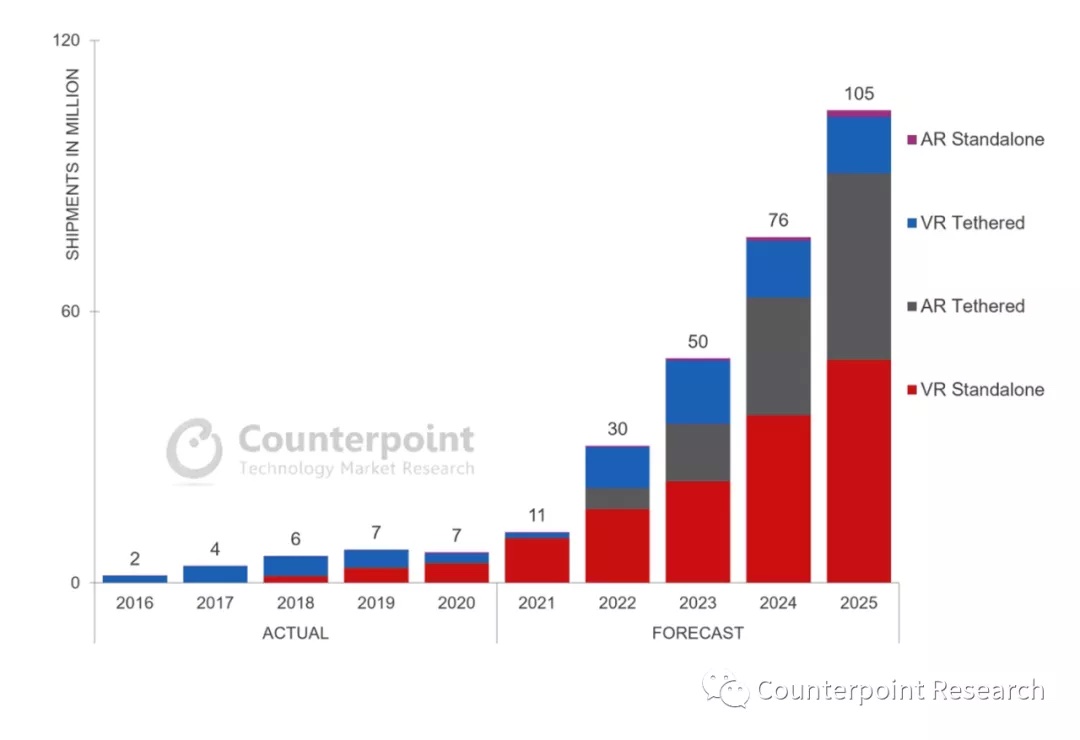在谈论商场动态时,高档分析师 Karn Chauhan表明:“VR Standalone(独立设备)已成为游戏范畴的首选设备类型,这首要是由于Oculus Quest 2的成功。这种无线的外观形状是 XR 头显的未来。VR Standalone 比VR Tethered 更受 OEM 和顾客的喜爱,也是由于外形的要素使得这种有线形状设备的添加相对缓慢。AR 从2016年开端是一个小的细分商场,首要服务于高标准高单价产品的企业细分商场。这种现状在不久的将来不太可能改动。但是,跟着 Apple 有望进入 AR Tethered 范畴,咱们估计到 2025 年它将成为添加最快和第二大的外观形状。这也将促进更多其他品牌的参加,尤其是智能手机 OEM。”