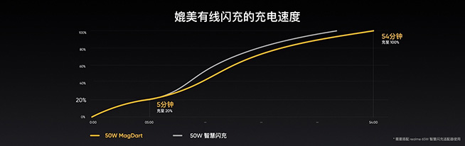 realme首款概念手机——realme Flash搭载4500 mAh的电池,运用50W MagDart磁吸无线闪充适配器,只需求5分钟就能够充电到20%, 54分钟即可充电至100%。这个充电速度简直与有线的50W才智闪充相同。